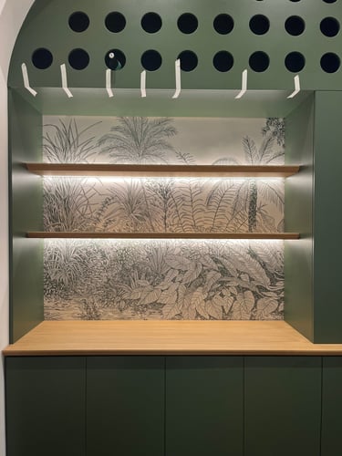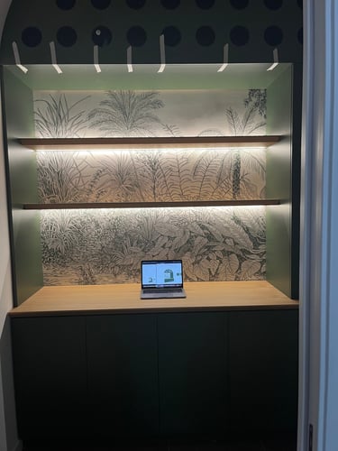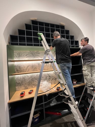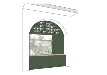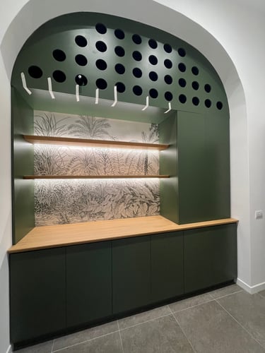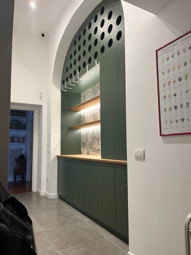 Il mobile si sviluppa all’interno di una nicchia in un ambiente di passaggio. La necessità di sfruttare interamente lo spazio con la volontà di non restringere troppo il corridoio hanno giocato un ruolo chiave nella progettazione del mobile che segue uno sviluppo ad L con un anta a tutta altezza e mobili bassi; al centro è stato ricavato una nicchia a giorno con mensole mentre sul lato superiore è stata ricavata una bottigliera vini.