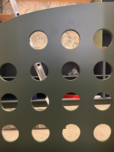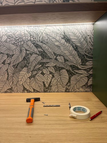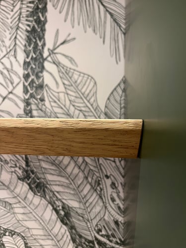 Il mobile presenta una struttura in legno listellare, con interni rifiniti in laminato e ante esterne laccate; le mensole interne e il top esterno sono realizzati in legno rovere; sul fondo della nicchia invece è stato applicato un parato.